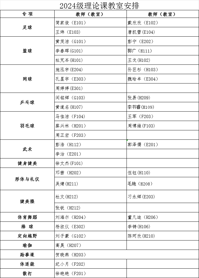 经教务处同意,本学期2024级、2025级本科生第13周体育课为体育教学理论课,12月8日起恢复户外教学。根据教室资源状况,现将理论课具体安排通知如下: