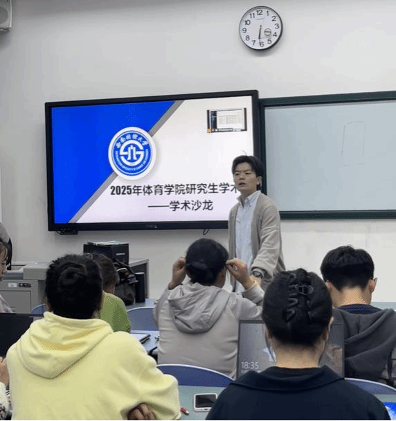 沙龙特邀三位2025级研究生进行学术分享。体育教学专业李科涵系统介绍了文献综述的完整流程,重点演示了检索策略制定与Endnote文献管理工具的高效使用方法。社会体育指导专业祝诗宇深入剖析了叙述性、范围性及系统性三类文献综述的特点与适用场景,并分享了文献笔记整理技巧。蔡洪燕以“SPSS数据分析在体育学科研究中的实践应用”为题,详细讲解了从描述统计到中介调节效应等关键数据分析方法。